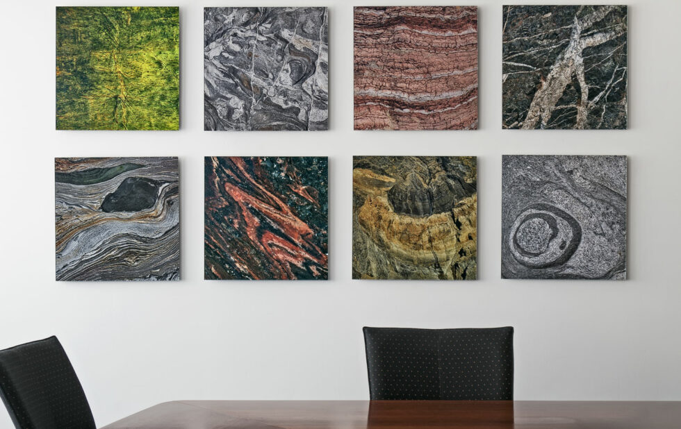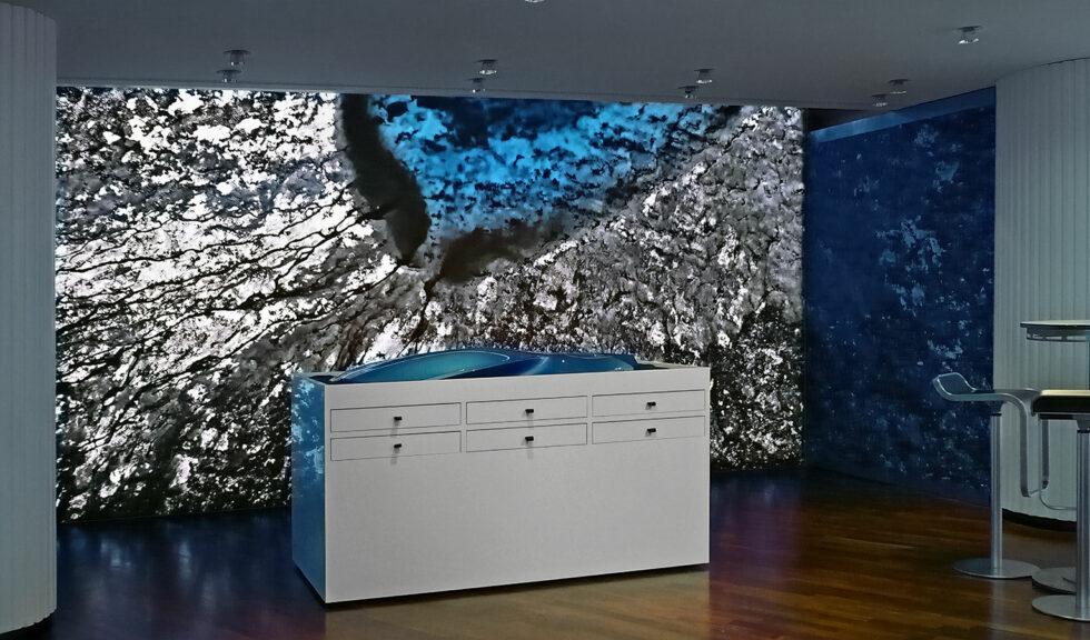 Im großen Sitzungssaal (Bilder links) hängen insgesamt 14 Motive aus der Werkserie „Wasser“ – das größte mißt 150 x 150 cm. In einem kleineren Sitzungssaal hängen insgesamt 10 Motive aus der Werkserie „Rocks & Mountains“.